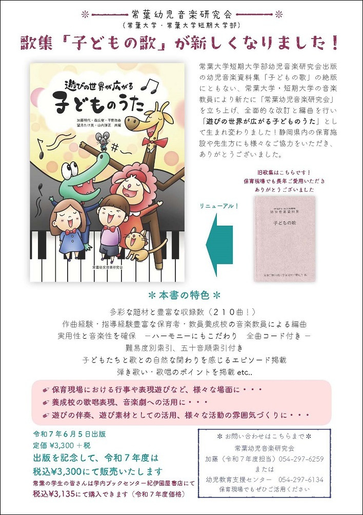 常葉大学短期大学部幼児音楽研究会出版の幼児音楽資料集『子どもの歌』の絶版にともない、常葉大学・短期大学の音楽教員により新たに『常葉幼児音楽研究会』を立ち上げ、全面的な改訂と編曲を行い『遊びの世界が広がる子どものうた』として生まれ変わりました。