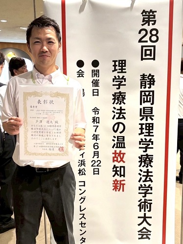 保健医療学部理学療法学科の芦澤遼太助教が、昨年(2024年)の第27回静岡県理学療法学術大会で優秀賞を受賞し、6月22日(日曜日)に行われた第28回静岡県理学療法学術大会で表彰されました。