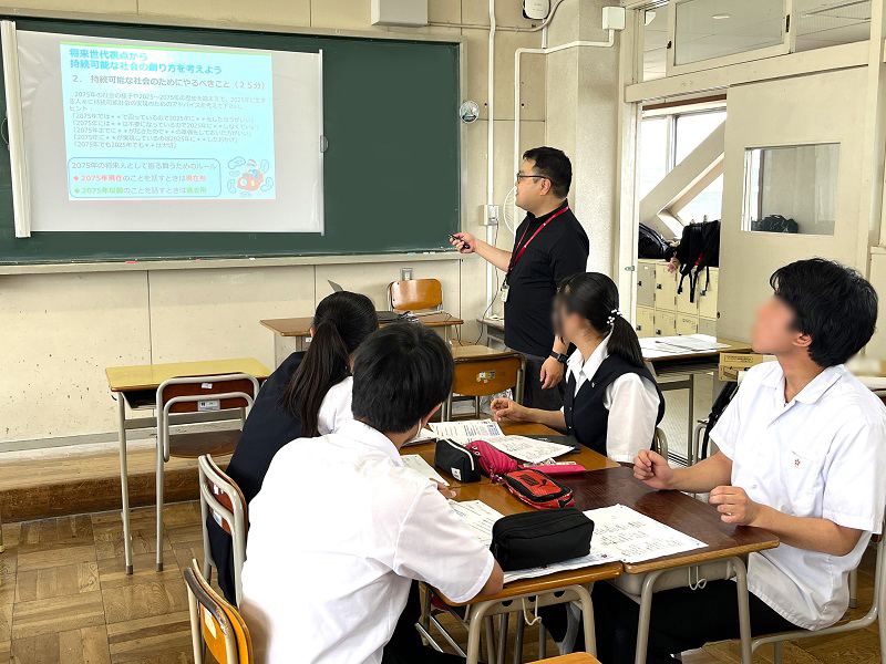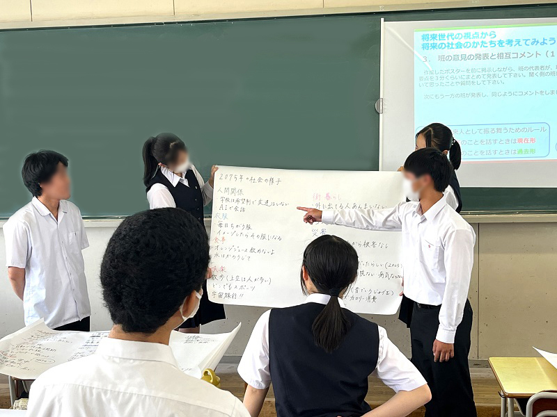 『将来世代視点から考える持続可能な社会のかたち(フューチャー・デザイン)』と題して、持続可能な社会について興味を持つ2年生8名が、50年後の将来社会に住む高校生の視点に立って、2075年の将来人である自分たちが住む社会の形や、持続可能な社会を実現するための2025年の人たちに向けたアドバイスを考えました。受講者は楽しく、かつ真剣に議論し、農業に取り組むことや体温調節が可能な服を開発することなどが持続可能な社会のために重要だというメッセージを考えました。