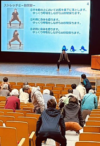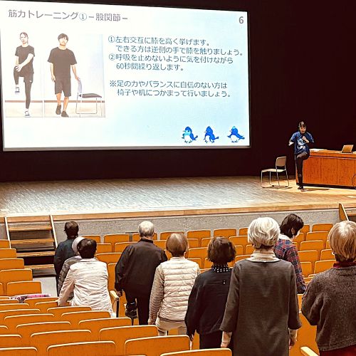 当日は、筋力トレーニングやバランス運動など、自宅で無理なく続けられる運動を参加者の皆さまと一緒に実践し、週に2~3回を目標に取り組むことの大切さをお伝えしました。