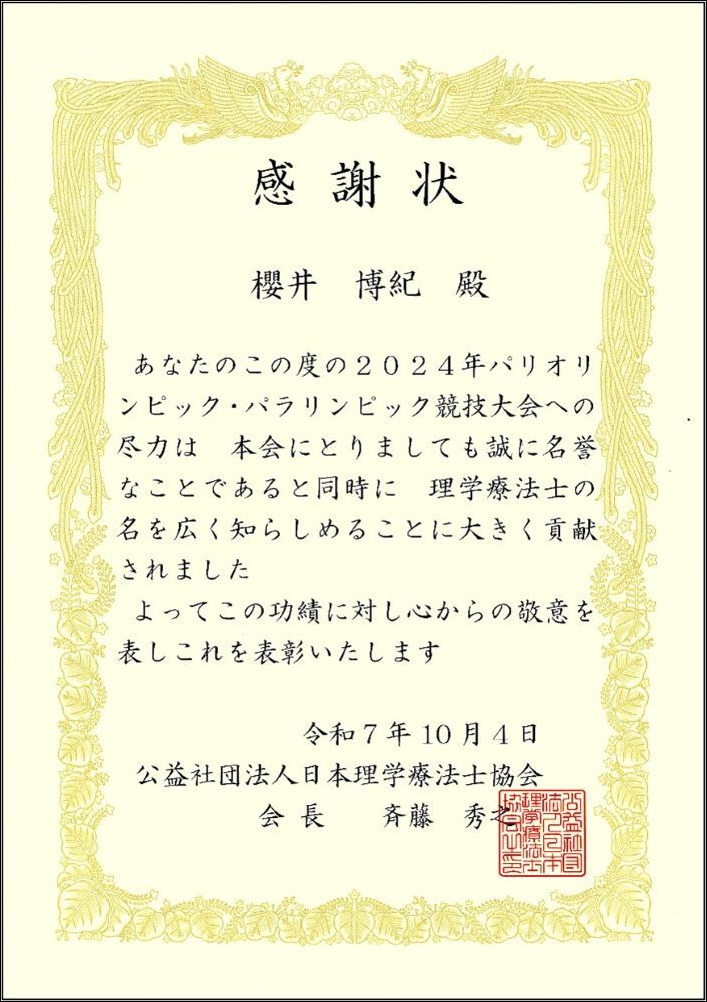 ボッチャ日本代表チームのコーチとして活動する保健医療学部理学療法学科の櫻井博紀教授が、パリ2024オリンピック・パラリンピック競技大会への貢献として日本理学療法士協会から感謝状を授与されました。 関連リンク 教員を知ろう! 櫻井博紀教授についての情報はこちら 保健医療学部 保健医療学部についてはこちら 理学療法学科 理学療法学科についてはこちら 関連ニュース パリ2024パラリンピック競技大会 日本代表選手団 ボッチャ競技でコーチとしての派遣が決定しました/理学療法学科 櫻井博紀教授 関連ニュース パリ2024パラリンピック競技大会 ボッチャ日本代表選手団のコーチとして参加しました/理学療法学科 櫻井博紀教授