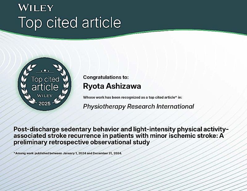 保健医療学部理学療法学科の芦澤遼太助教が執筆し、Physiotherapy Research International に掲載された論文が、Top Cited Articleに選出されました。