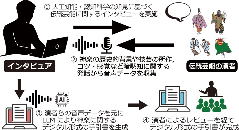 そこで本研究プロジェクトでは、本学の各分野における専門家による学術的な視点を集結し、大規模言語モデル(LLM)を用いたデジタル手引書作成や、可読性に優れる五線譜に変換するためのAIによる和楽の自動採譜など、AI技術を活用した暗黙知の解明と伝統芸能の継承支援に取り組み、地域文化を未来へとつなぐ新たな可能性を切り拓くことを目指します。
