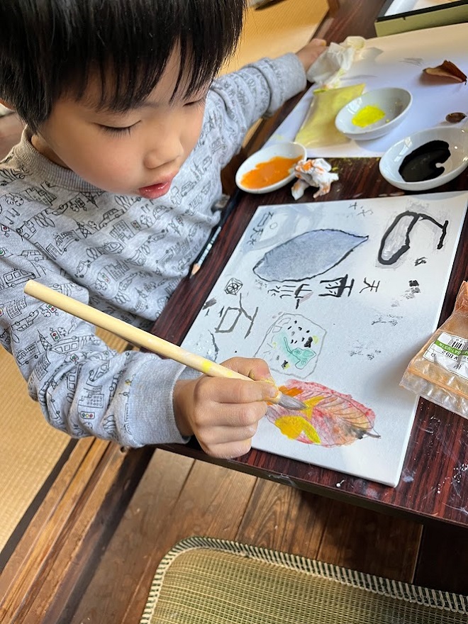 ワークショップには保育科学生4名がボランティアとして参加し、幼稚園の子どもから大人まで約15名と共に日本画制作を楽しみました。