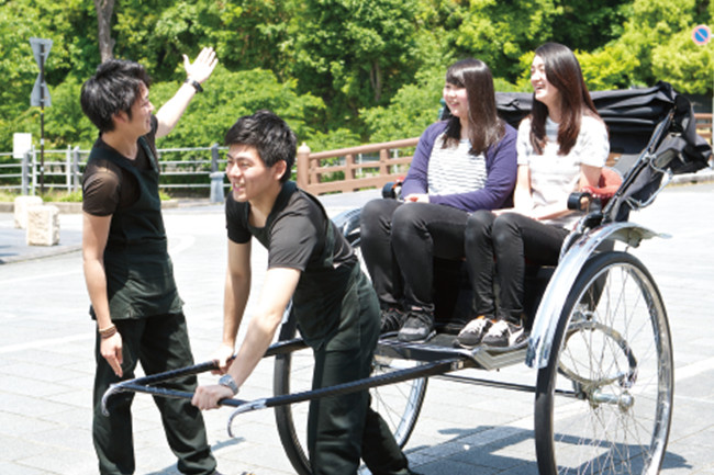 経営学部の学生による地域活性化プロジェクト。掛川城周辺で人力車事業を行っています。経営学の知識を活かし、模擬株式会社「人力車常葉組」を設立。社長や人事担当など、すべての学生が役割を持ち、運営しています。はじめた頃は、お客さんが少なかったこのプロジェクトもみんなでアイデアを出し合い、営業活動をしたり、メディアに取り上げられたことにより、周囲に認知され集客もアップしました。
