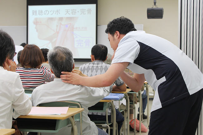地元の方々の健康を見直す機会にしていただこうと、健康プロデュース学部、保健医療学部の学生を主体に、5年前より実施している健康フェア。リピーターも増え、地域では定着したイベントになっています。さまざまな項目の測定を行い、学習した知識を活用し食生活や運動についてアドバイスしました。健康相談コーナーでは、健康鍼灸学科の学生が来場者の腰痛やひざの痛みなどの悩みに応え、刺さない鍼を使用したアドバイスや揉みほぐしを実施しました。