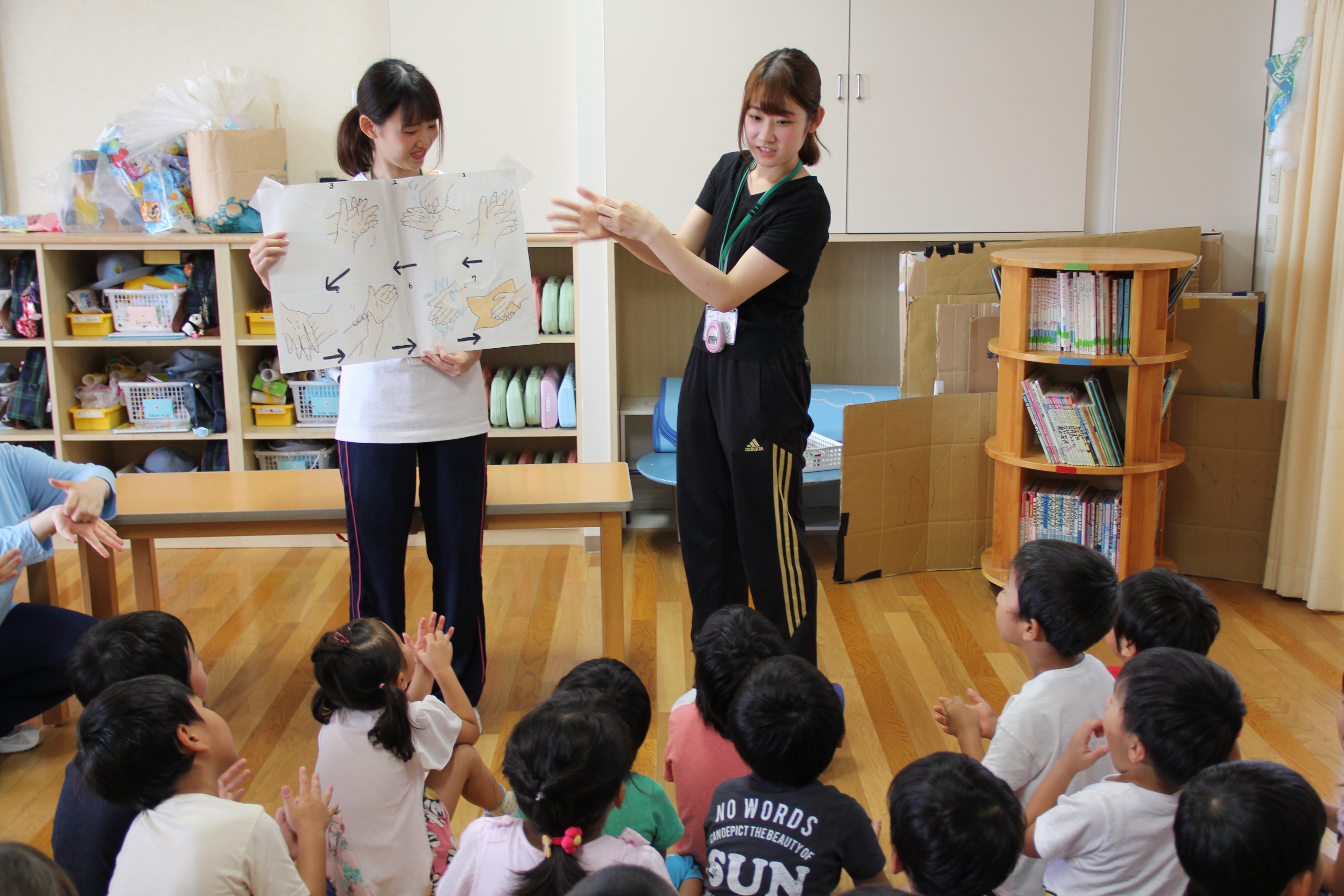看護学科の学生で結成する“手洗いチェッカーズ”が近隣の幼稚園を訪問し、園児に手洗い指導を行いました。「基礎看護学」で学習した手洗いの技術を園児に伝え、清潔意識の向上や手洗い方法の習得が目的。学生は手洗いチェッカーを使って、園児一人ひとりの手の汚れチェックを行い、同時に手洗い方法を伝えていきました。