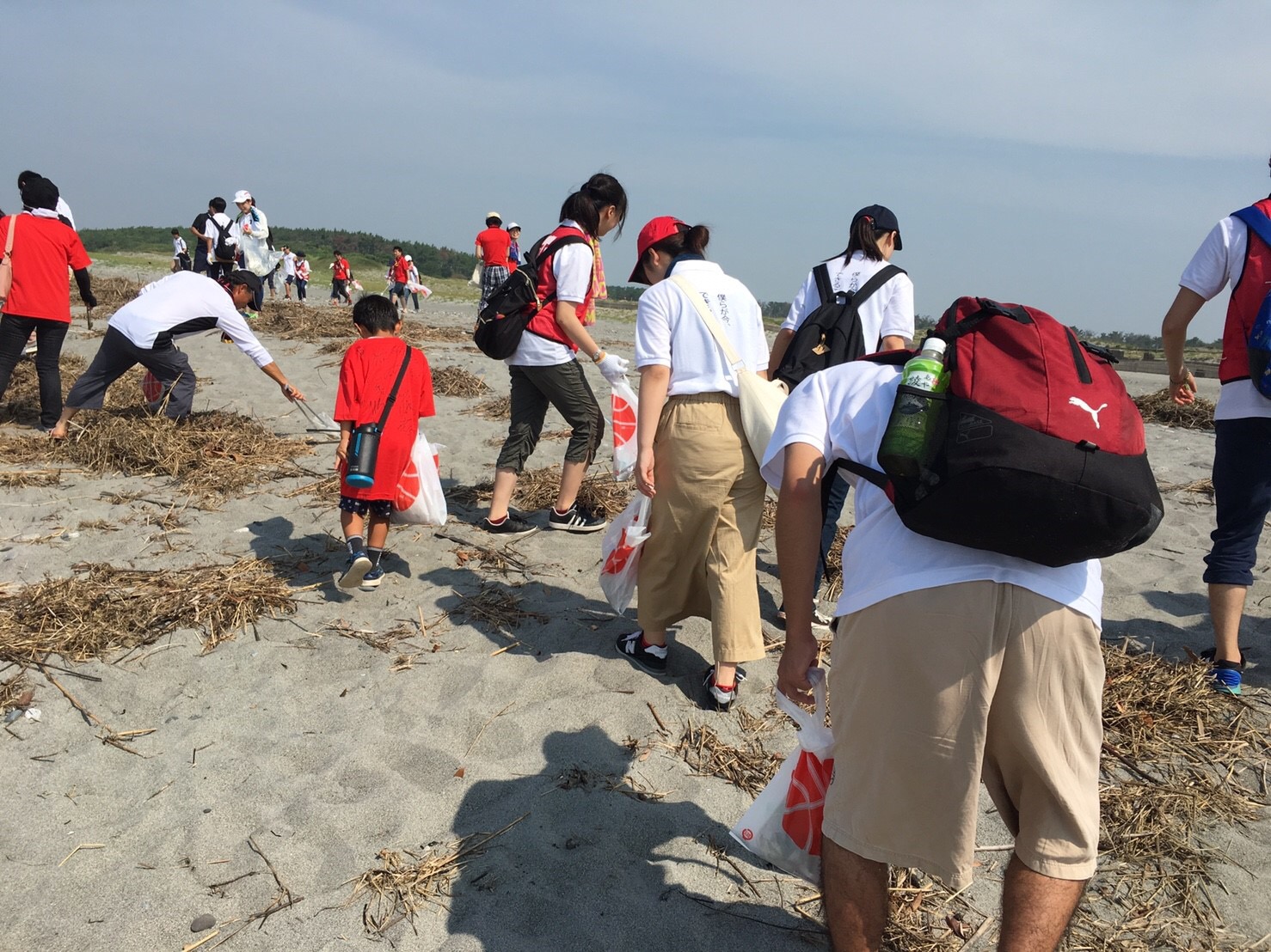 ネオフェニックスの選手、ファンや関係者、本学学生がフェニックスカラーの赤を身に着け、チームに分かれ中田島砂丘のゴミ拾いを行いました。