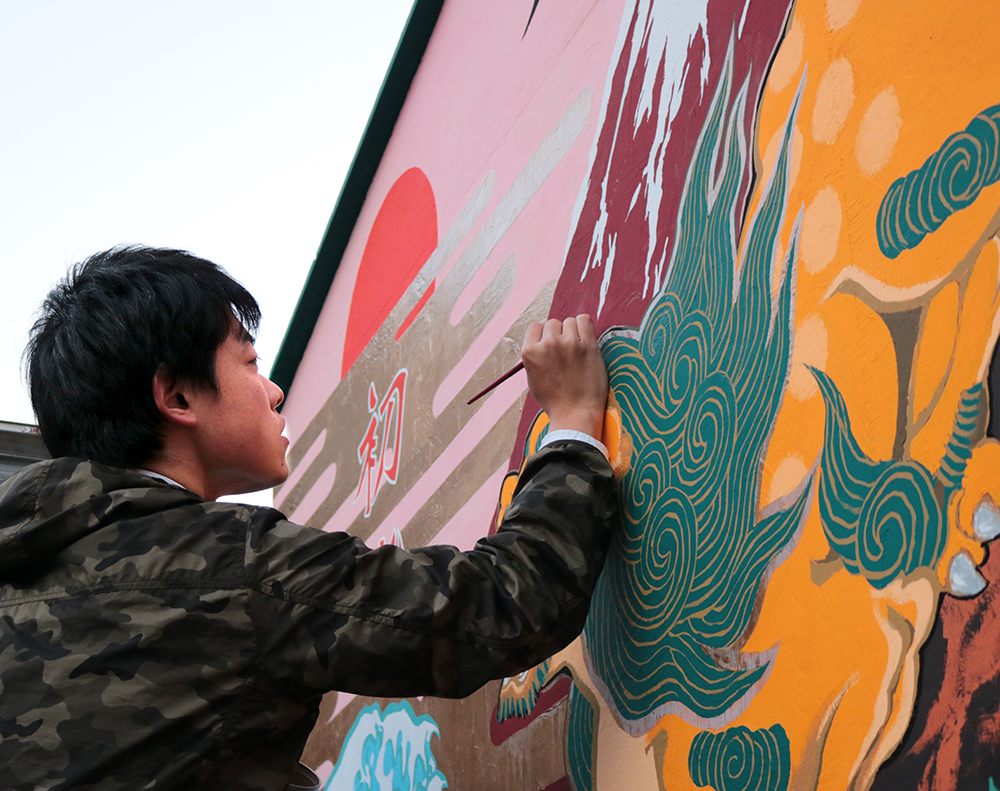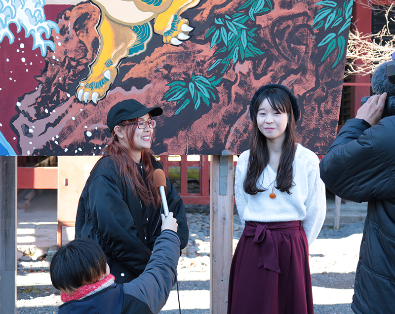 造形学部の学生が2週間かけて制作した、2018年のえと「戌(いぬ)」の大絵馬(高さ約2.7メートル、幅約2.6メートル)が、静岡市の静岡浅間神社に飾られ、参拝者を迎え入れています。造形学部による恒例の制作で、6年目を数えます。 赤富士を背景に、困難を意味した荒波に、こま犬が力強く立ち向かっていくデザインで、「見た人が絵に力強さを感じて、新年に希望を持ってくれた」と制作に携わった学生は願いを込めています。