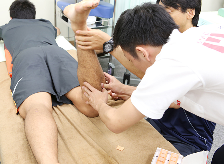 痛みの改善が期待される箇所へ刺さない鍼を貼付して治療を行います。貼ったまま練習を行うことができ、 選手の多くから、痛みが軽減され、コンディションが改善されたとの声が挙がっています。
