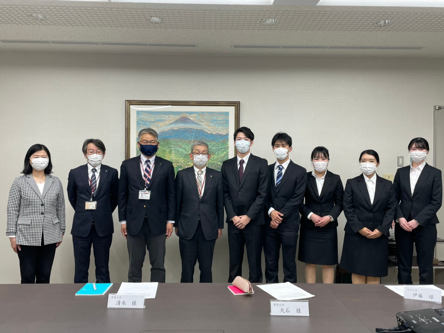 経営学部小豆川ゼミの3年生は、「若者のライフスタイルとクルマの未来」をテーマに、静岡トヨタ自動車株式会社代表取締役太田 勝之社長をはじめ役員・幹部の方々を対象に、成果報告会を開催しました。本研究は、自動車業界における若者クルマ離れやCASE、MaaSなど100年に1度の転換期の状況やコロナ禍で地域内観光、マイクロツーリズムへの需要拡大を背景に、大学生のクルマの需要喚起に関する検討と静岡県の魅力とクルマの魅力・楽しさの発信、これらを通じて静岡地域の活性化の一助とすることを目的に実施されました。
