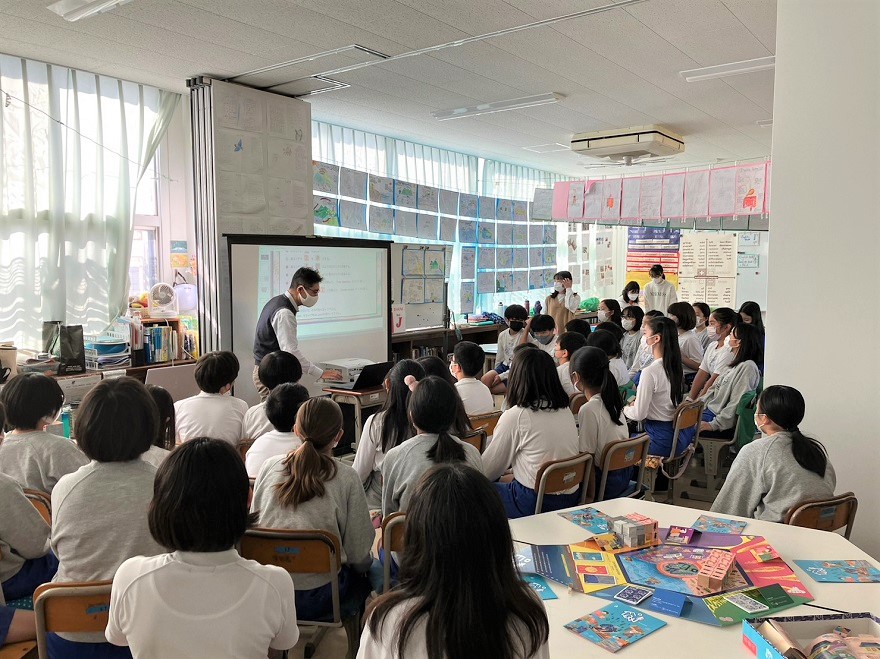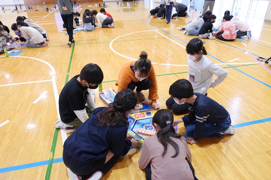 造形学部と外国語学部の学生が、SDGsの取り組みを学ぶことができる協力型ボードゲーム「FLOW」を使って、小学校でワークショップを行いました。「FLOW」は明治時代の静岡県、天竜川の材木と伊豆半島の石(伊豆石)の取引を題材としています。山に木を植えると、川の防災に役立ち、育った木は材木となります。そして得た利益でまた木を植えたり、石の蔵を建てたりします。こうして資源と経済が循環する持続可能(サスティナブル)な関係性を学ぶことが目的です。