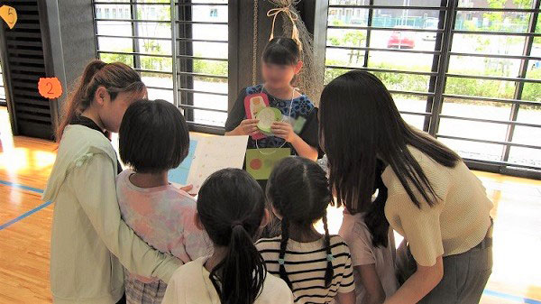 当日は、”Word Relay(単語を取ってくるリレー)”、“How Daruma-san spends his summer vacation(だるまさんが転んだ英語バージョン)”、”Shopping game(英語でお買い物ごっこ)”、”Color Tag(英語で色オニ)”、”Rock Paper Scissors Train(英語でじゃんけん列車)”を行いました。最後のじゃんけん列車では、保護者も学生も入り、楽しく終わることができました。また、今回は、未就学児への絵本の読み聞かせも行いました。