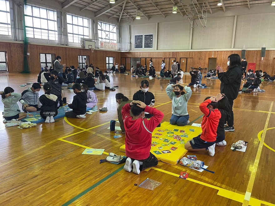 『健幸』についての理解を深めてもらうための講義を学生が行った後、かるたをしました。読み札には「困ったらお互い様で助け合おう」「寝る前のスマホは要注意」など、日々の生活を題材にした内容となっており、児童はその様子を思い浮かべながら楽しく取り組みました。小学校の先生方からも、「読み札の内容がポジティブなので、とても幸せな空間になった」とお言葉をいただきました。