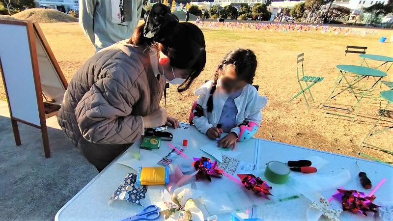 テーマは『風のヒロバ』です。強い風が吹くこの場所の特性を生かして、風車やシャボン玉、凧などを使い風を感じていただけるような内容を考えました。