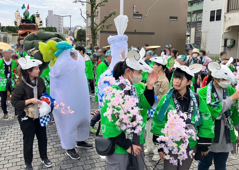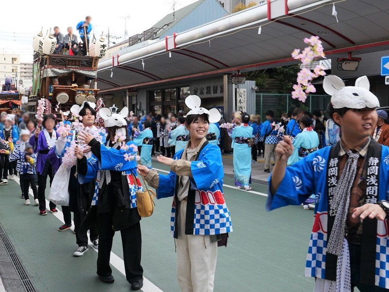 造形学部のアート領域、環境デザイン領域の学生が、廿日会祭にて静岡まつりのボランティアと共に踟に参加しました。 造形学部では、廿日会祭踟装束再現プロジェクトに取り組んでおり、 江戸後期の史料に残されている、廿日会祭の踟にて『甲子福祭り』をお題としたネズミと二股大根、御神酒徳利などの仮装行列が描かれた絵図をもとに仮装行列の再現を試みました。 当日は制作したネズミのお面を被り、本部踟と当番踟に加わり街の中を歩きました。