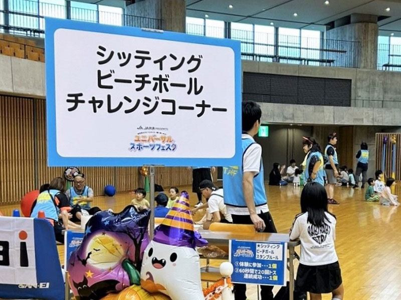 メインアリーナでは、心身マネジメント学科村本ゼミの学生が一般社団法人ASOBIとともにシッティングビーチボールや車いすバスケットボールの体験ブースを運営しました。
