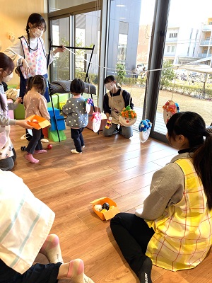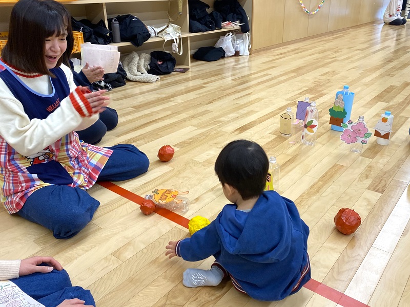 短大保育科の2年生『乳児保育演習』の授業の成果を生かして、雪や豆まきなど季節を意識したあそびや、凧・けん玉・福笑いなどの伝統的なあそび、積み木やボーリングなど身体を動かすあそびなど、0・1・2歳児の子ども達が楽しめるようにと考えて企画をしてきました。当日は、主に1・2歳児のお子さんたちが遊びに来てくださり、何度も何度も繰り返し楽しんだり、子ども達同士で関わったり、緊張しながらお姉さん達と遊んだりと、学生たちの予想を超えた多様な姿も見せてくれました。