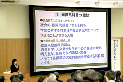 第1部は、「新たな全学部共通教養教育科目の体系(骨子)と趣旨」として、これまで各ワーキンググループ(WG)で検討されてきた内容の発表がありました。