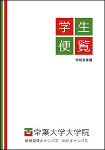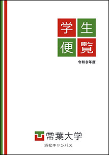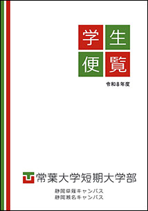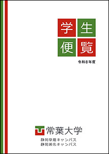 各キャンパスの学生便覧を、デジタルパンフレット形式でご覧いただけます。 ページ内目次 静岡草薙・静岡瀬名キャンパス 静岡水落キャンパス 浜松キャンパス 大学院 短期大学部 静岡草薙・静岡瀬名キャンパス 2026年度 常葉大学 静岡草薙・静岡瀬名キャンパス学生便覧 [画像をクリックするとご覧いただけます] 静岡水落キャンパス 2026年度 常葉大学 静岡水落キャンパス 学生便覧 [画像をクリックするとご覧いただけます] 浜松キャンパス 2026年度 常葉大学 浜松キャンパス 学生便覧 [画像をクリックするとご覧いただけます] 大学院 2026年度 常葉大学 大学院 便覧 [画像をクリックするとご覧いただけます] 短期大学部 2026年度 常葉大学 短期大学部 学生便覧 [画像をクリックするとご覧いただけます] ページの先頭へ戻る