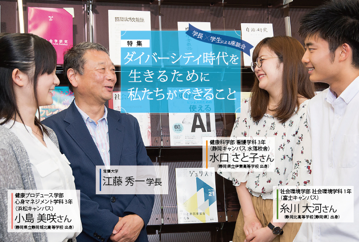 学長 こうしてさまざまな意見を交わすことによって、異なる価値観を吸収していくことにつながっていくと思います。多様な考えを受け入れ、自分の考えを深め伝えていく。そうして個性や能力を磨くことを繰り返していくことが、ダイバーシティそのものなのでしょうね。常葉大学は10学部19学科の多様な学びを持つ総合大学ですから、学生同士の交流がもっと活発に行われるといいですね。それを基に幅広い考え方を持った人材を育て、地域貢献をしていくことが常葉大学の役割でもあると思います。